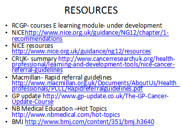 NICE CANCER GUIDELINES 2015 http://www.cancerresearchuk.org/health-professional/learning-and-development-tools/nice-cancer-referral-guidelines